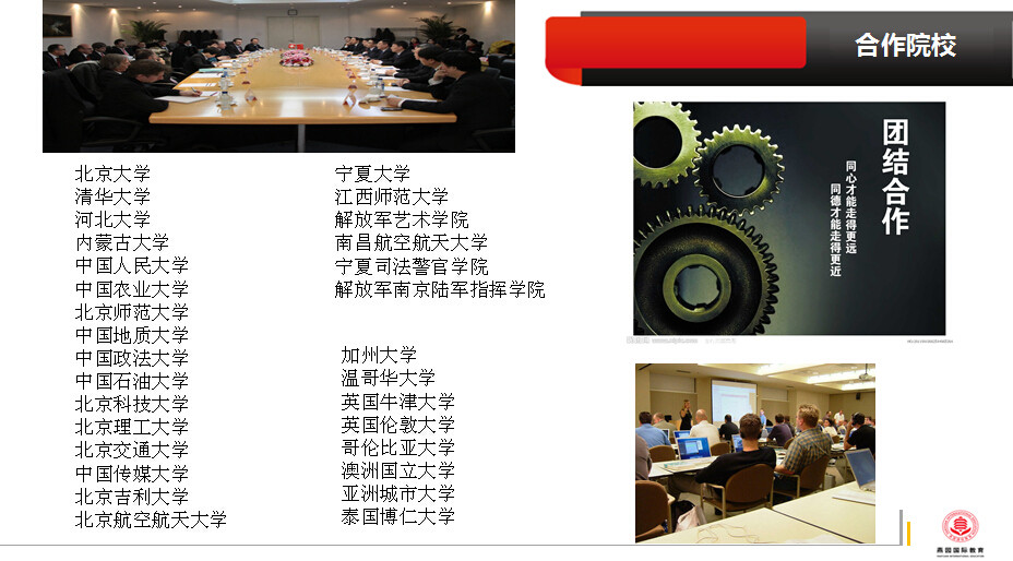 北京大学、清华大学、河北大学、内蒙古大学、中国人民大学、北京师范大学、中国地质大学、中国政法大学、北京理工大学、北京吉利大学、加州大学、温哥华大学、英国牛津大学、英国伦敦大学、澳洲国立大学、亚洲城市大学、泰国博仁大学等著名院校。