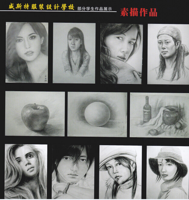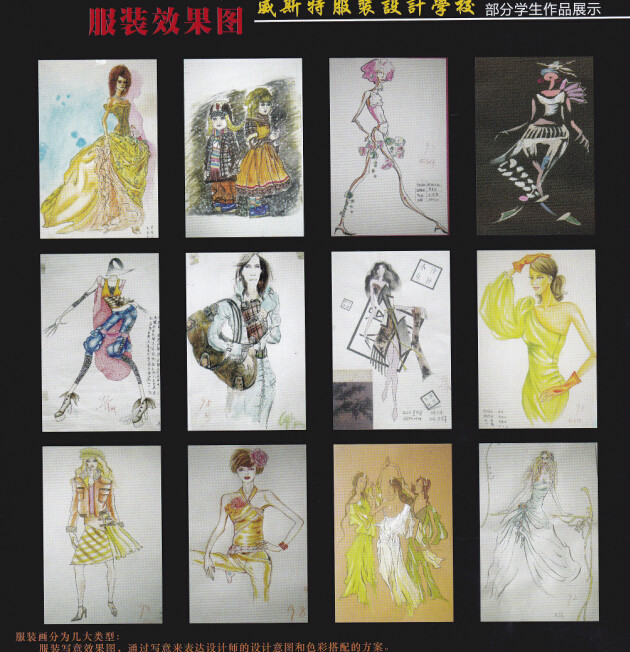 服装美术、素描、色彩、图案设计、服装效果图、面料再造、时装设计、成衣设计、陈列设计、化妆;