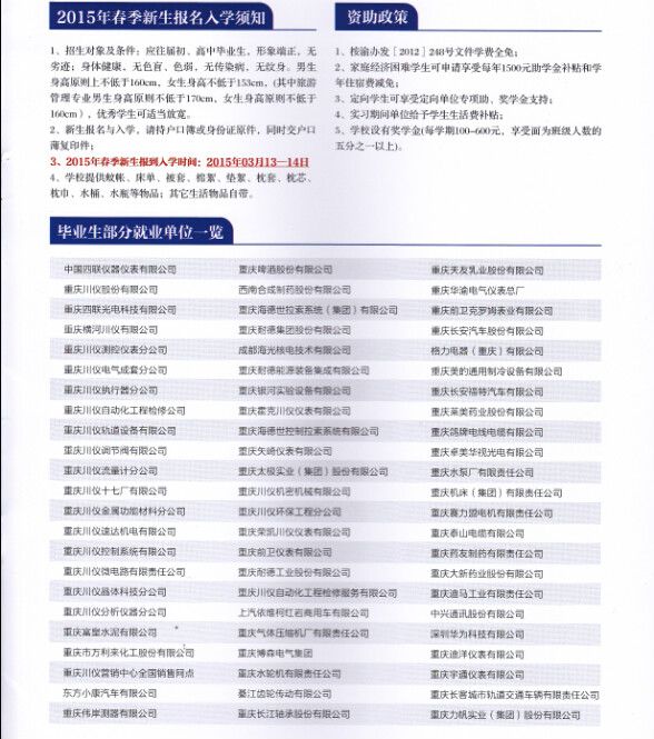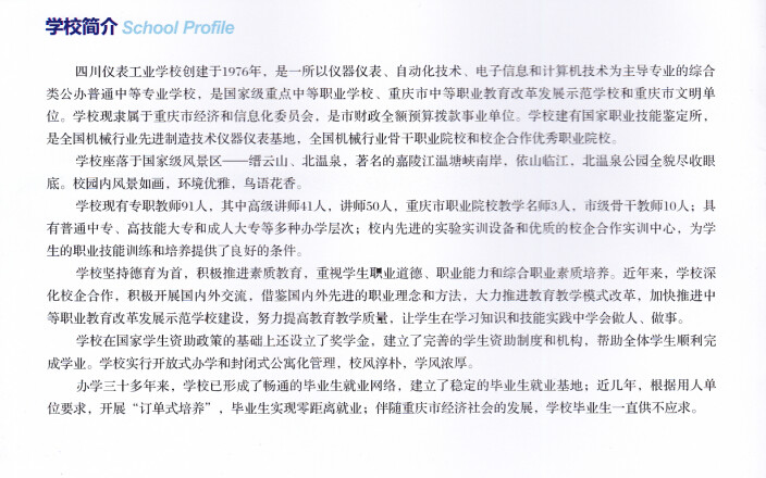 四川仪表工业学校创建于1976年,是一所以仪器仪表、自动化技术、电子信息和计算机技术为主导专业的综合类公办普通中等专业学校,是国家级重点中等职业学校、重庆市中等职业教育改革发展示范学校和重庆市文明单位。