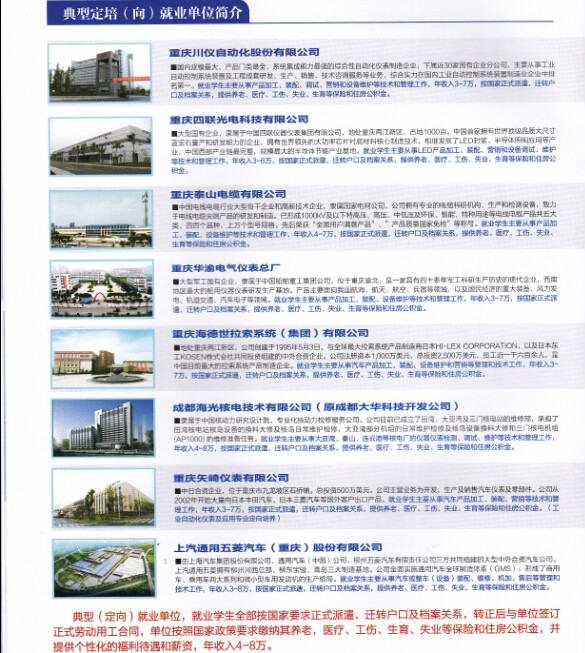 ★典型定培(向)就业单位,就业学生全部按国家要求正式派遣,迁转户口及档案关系,转正后与单位签订正式劳动用工合同,单位按照国家政策要求缴纳其养老,医疗,工伤,生育,失业等保险和住房公积金,并提供个性化的福利待遇和薪资,年收入4~8万。
