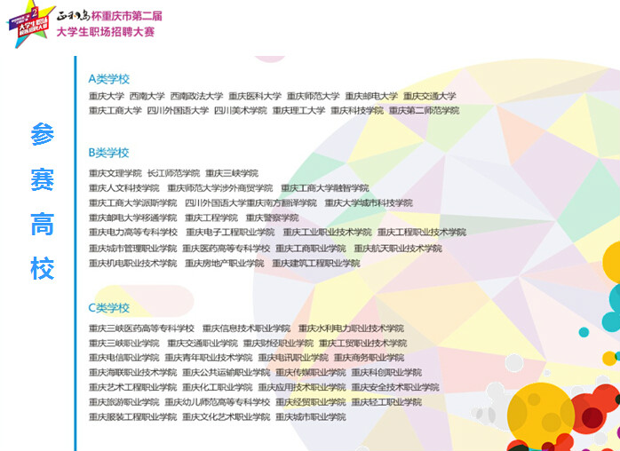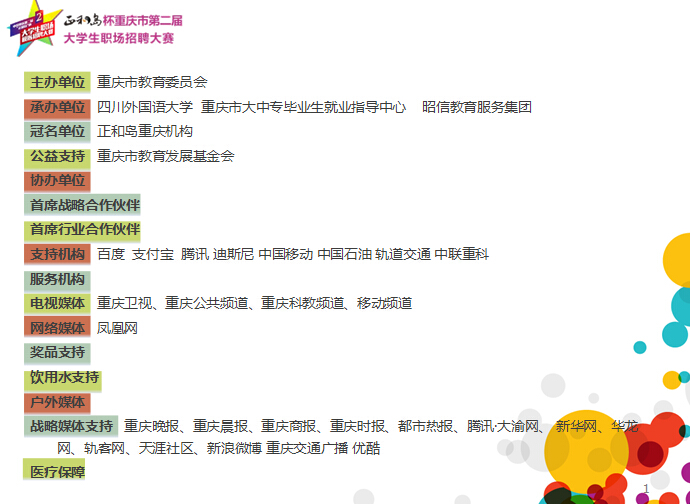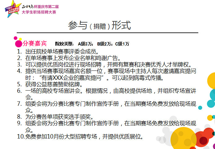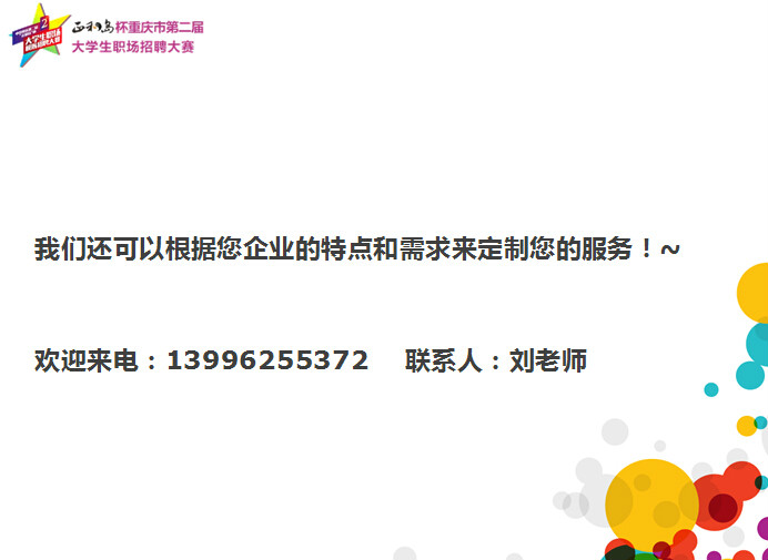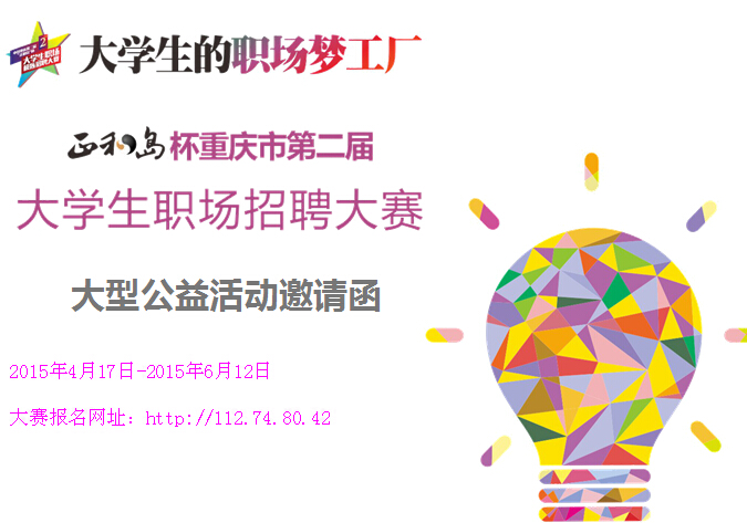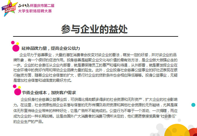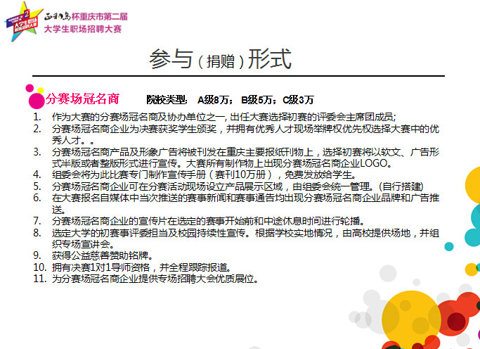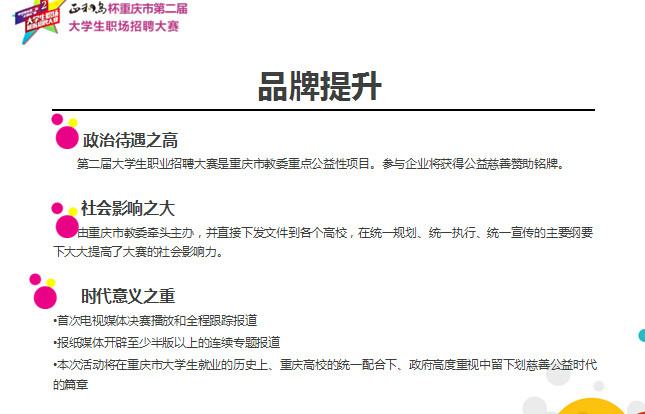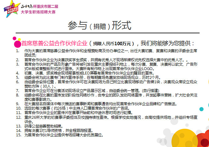 重庆“正和岛”杯第二届大学生职业招聘大赛是重庆市教委的组织下开展的针对高校毕业生就业、职业素养提高的大型公益赛事活动。现初赛已全部结束,各高校初赛选出的优秀选手将在学校的统一组织安排下齐聚四川外国语大学,参加2015年6月12日举行的决赛,企业的双选会同时举行,到时将有重庆各高校学生到决赛现场参与活动,这是企业宣传推广、产品销售、人员招聘等拓展高校市场的大好时机,大赛组委会为感谢企业的参与,我们特为企业制定了如下回馈方案: