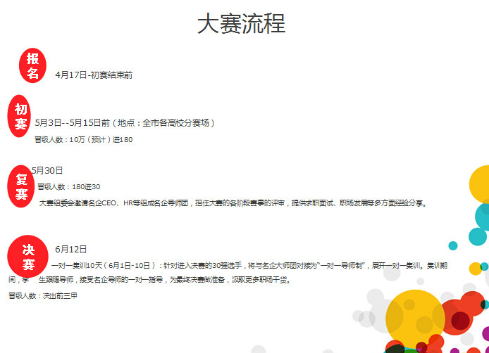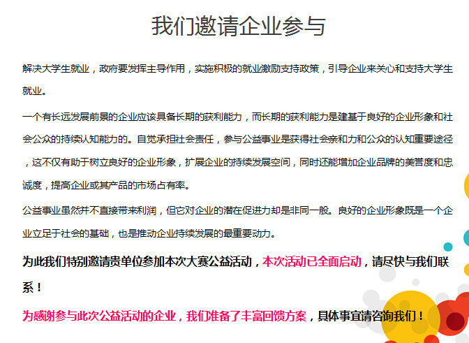 在近六万大学生报名平台的自媒体中,推送决赛新闻和赛事通告,并出现决赛嘉宾企业品牌或者形象推送。大赛结束后,在自媒体上持续推送企业品牌。报名网址:http://112.74.80.42