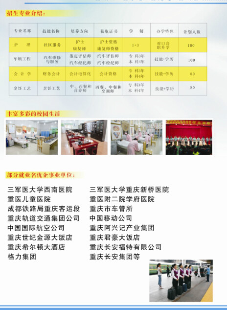 学院以学历教育为主,对外常年开展短期培训。是重庆市人力资源和社会保障局部分工种的高级技师、技师、高级工定点培训、集中鉴定机构,是全国“家政工程”定点培训单位。