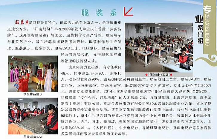 服装系是我校最具特色、最富活力的专业系之一,是重庆重点建设专业。“江南缝纫”早在2009年成为重庆市首批“劳务品牌”。我校该系较大比例毕业生远赴香港、约旦、日本、新加坡、美国等国家和地区就业。《人民日报》、中央电视台、香港凤凰电视台等多家媒体多次报道江南服装专业学生的优秀成绩。