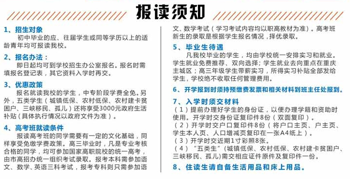 凡我校毕业的学生,均由学校统一安排实习和就业,学生就业免费推荐、双向选择;学生就业去向重点在重庆主城区;高三年级学生带薪实习,所得实习补贴全部发给学生,学校绝不收取任何管理费用。