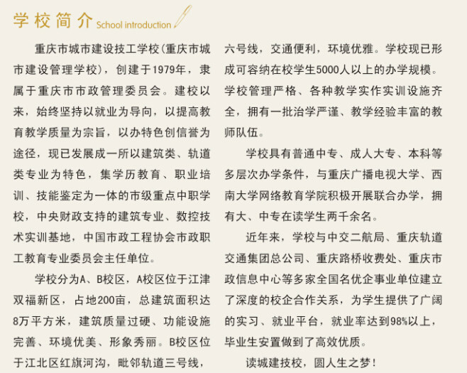 重庆城市建设管理学校是重庆市重点公办中等职业学校,我校的建筑类抓呢已经成为学生抢读、企业抢选的热门专业,占学校招生总数的70%以上。