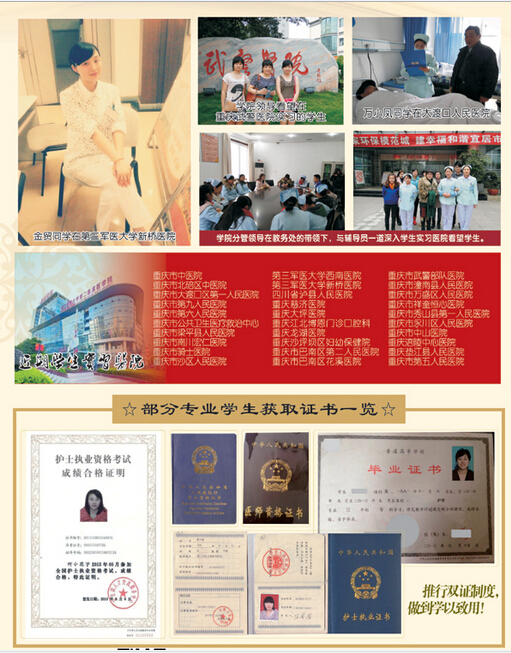 重庆第三人民医院、重庆第六人民医院、重庆第九人民医院、重庆市中医院、武警重庆总医院、重庆市北碚区中医院、重庆巴南区人民医院、重庆市沙坪坝区人民医院、重庆市肿瘤医院、重庆市大渡口区人民医院、重庆南岸区第二人民医院、重庆大渡口第二人民医院、重庆陈家桥医院、重庆九龙坡第五人民医院等30余家医院简历友好合作关系,凡在校期间遵守相关规章制度、成绩合格或操行考核优秀的学生,学院就业指导中心将会全部安排实习,并予以推荐就业。