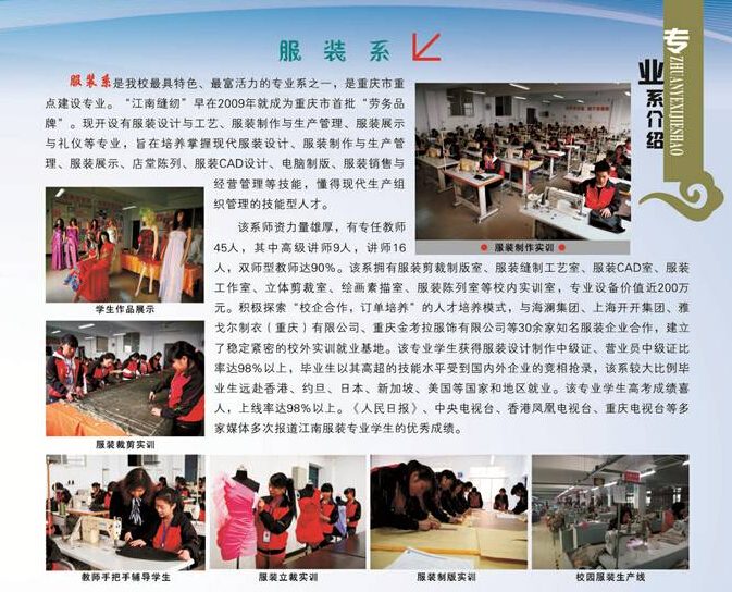 服装系专业是重庆江南职校最具特色、最优秀的专业之一,是重庆市重点建设专业。“江南缝纫”早在2009年成为重庆市首批“劳务品牌”。