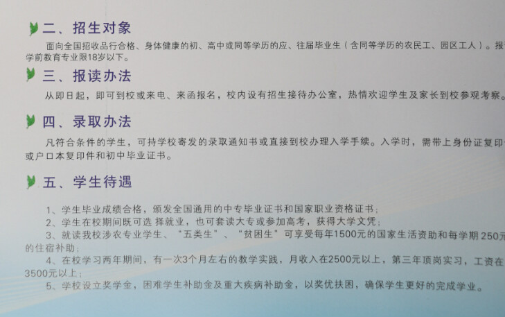 2、就读我校涉农专业学生、“五类生”、“贫困生”可享受每年1500元的国家生活资助和每学期250元的住宿补助。
