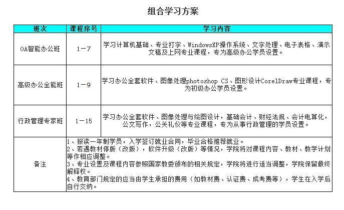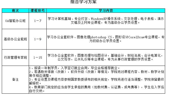 计算机基础、专业文字录入、windows Xp操作系统、Internet互联网、文字处理word、电子表格EXCEL、演示文稿powerpoint、photoshop CS、coredraw、基础会计、财经法规与职业道德、会计电算化、公文写作、公关礼仪、职业道德求职技巧与职业规划。