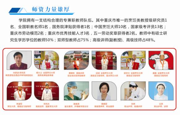 学校现有专职教职工180名,全国烹饪专业职教名师一名,中国烹饪大师、中国服务大师15名,国家级考评员13名;重庆市劳动模范2名,重庆市优秀技能人才3名。