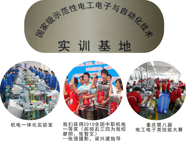 专业特色:机电技术应用专业是学校重点专业,获重庆市政府教学成果奖2项,渝北区政府教学成果奖3项。建有国家级示范性电工电子与自动化技术实训基地,并建有维修电工国家职业技能鉴定所;近年来学生对口高考升学率100%,本科上线率83%以上。毕业生初次就业率100%,专业对口率达到90%;“双证书”获取率达98%。