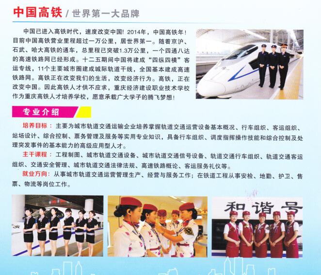 主干课程:工程制图、城市轨道交通设备、城市轨道交通信号设备、轨道交通行车组织、轨道交通客运组织、交通安全管理、城市轨道交通法律法规、高速铁路概论、客运服务礼仪等。