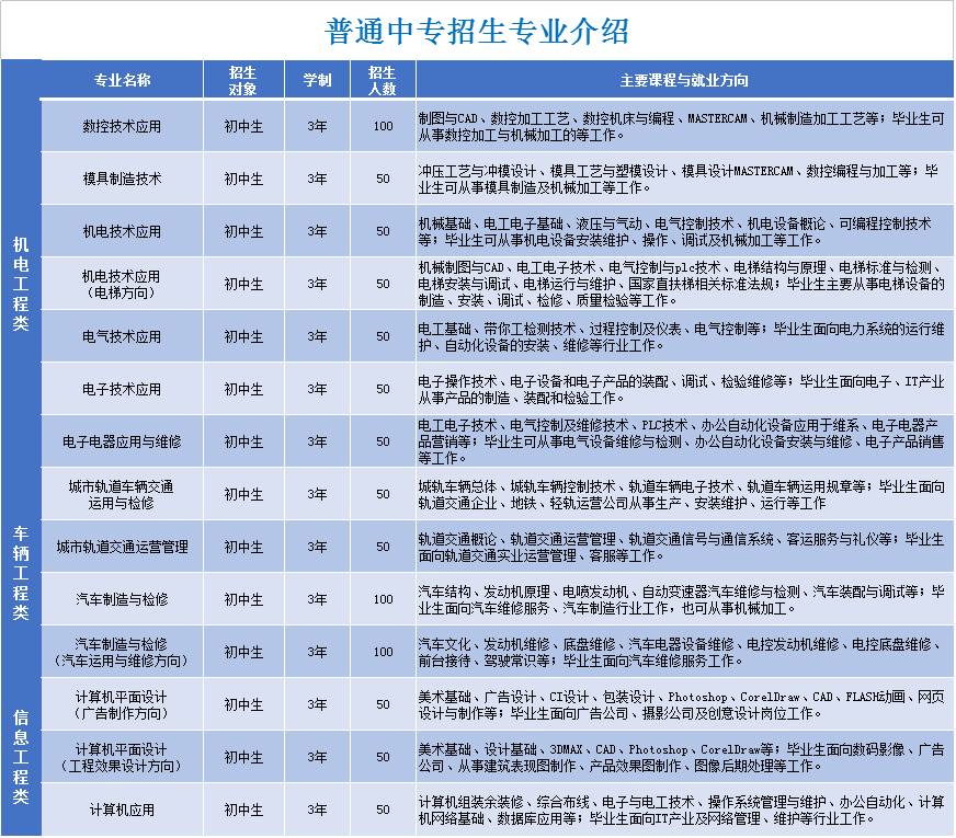 学校今年有数控、电子技术、计算机平面设计、会计、建筑工程、化学工艺等25个专业面向初中毕业生招收中专生2500名。
