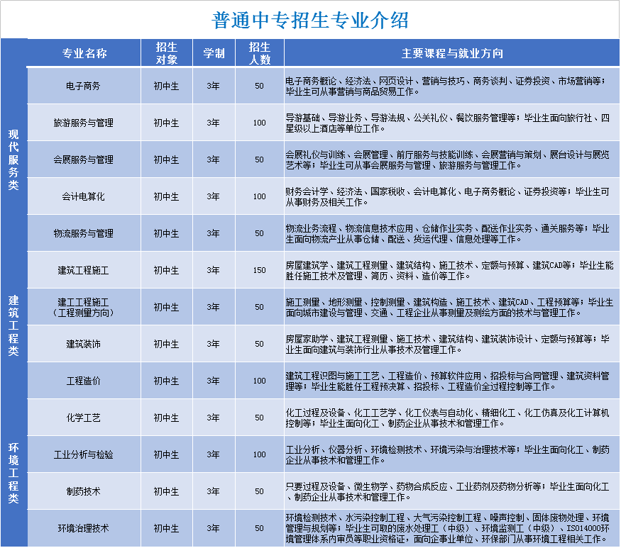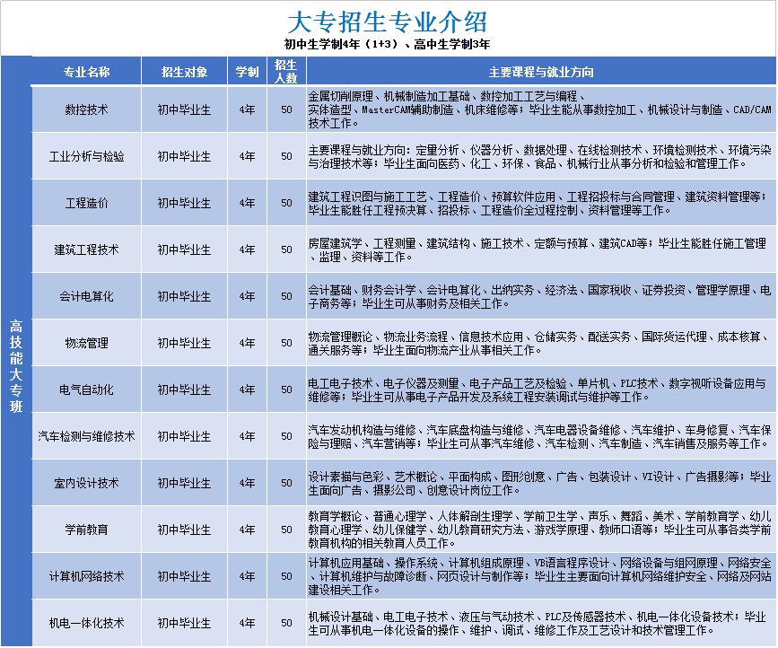 今年还有建筑工程施工、工业分析与检验、会计电算化、汽车检测与维修技术、工程造价、物流管理、数控技术、电气技术应用、机电一体化、计算机应用、装潢艺术设计等10多个专业招收大专班,初中生学制4年(1+3),高中生学制3年,毕业后由重庆科技学院颁发成人高等教育专科文凭。