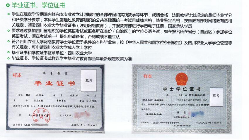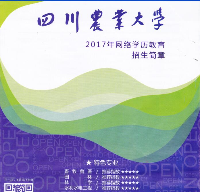 四川农业大学是一所特色鲜明,农、理、工、经、管、医、文、教、法多学科协调发展的国家“211工程”重点建设院校,也是教育部本科教学工作水平评估优秀高校。2002年经教育部教高厅(2002)2号文件批准,四川农业大学成为开展现代远程教育的试点高校,开始面向全国招收网络教育学生。根据教育部、四川省教育厅关于开展现代远程教育的规定,四川农业大学利用网络等现代技术手段开展本、专科教育,对达到毕业要求的学生颁发国家承认学历并电子注册的毕业文凭,本科毕业生符合学位授予要求的授予对应的学时学位证书。根据教育部文件精神,学校举鼎2017年继续面向社会招收网络教育高中起点专科和专科起点本科业余非全日制学历教育学生。