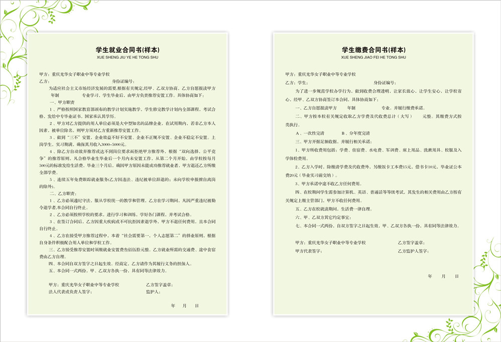 ■学生入学后,与学校签订《学生就业合同书》、《学生缴费合同书》、《学生缴费合同书》。由学校负责推荐安置工作。