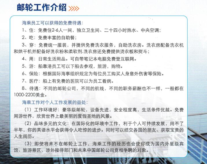 邮轮海乘,海乘是豪华游轮上的高级管理和服务人员的统称,随着邮轮旅游业的蓬勃发展,作为新生的职业——邮轮海乘越来越受到更多人的青睐。每一艘豪华游轮需要一千多到三千名员工。