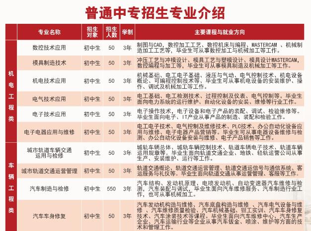 包括建筑工程施工、汽车运用于维修、制药技术、数控技术、机电技术、电气、城市轨道交通、工商企业管理、会计、计算机应用等专业,正在热招。