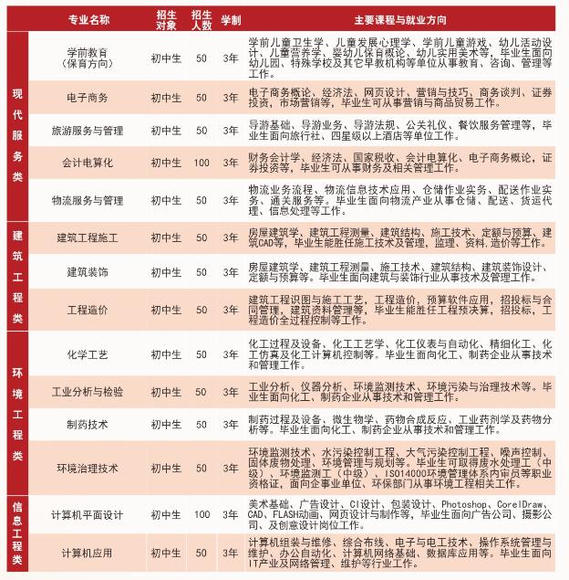 今年有数控、电子技术、计算机平面设计、会计电算化、建筑工程、化学工艺等24个专业面向初中毕业生招收中专生2500名。
