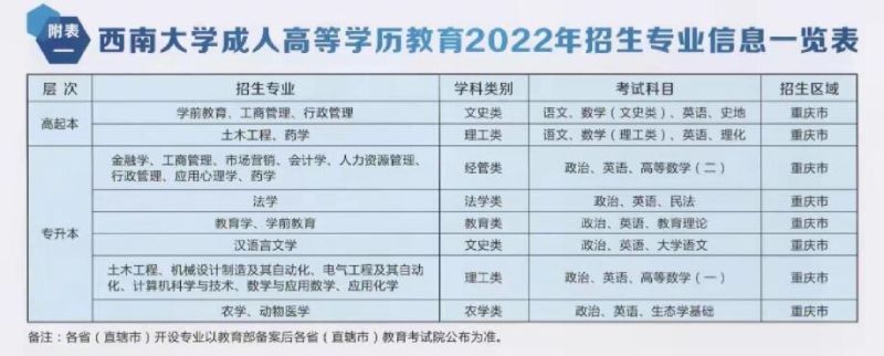 学校学科门类齐全,综合性强、特色鲜明,涵盖了哲、经、法、教、文、史、理、工、农、医、管、艺等12个学科门类。西南大学成人高等学历教育始于1956年,以教学质量优良,办学特色鲜明,专业设置齐全,办学规模适度而赢得了良好的办学信誉,热忱欢迎广大学子报读。