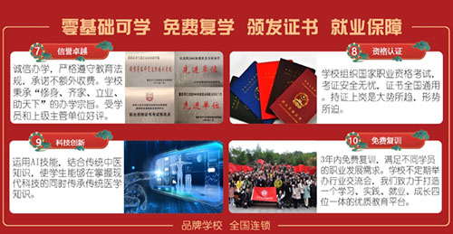 重庆市齐生职业技能学校成立1996年,以培养美容师、健康管理师、养老护理员、中医调理师、门店运营、室内设计师、景观设计师等专业技能人才为使命,为有志青年点燃希望之光。学校秉承“修身、齐家、立业、助天下”的办学宗旨,培养出众多专业人才,成为中医养生行业发展的中坚力量。专注于培养具有专业技能和商业操盘的健康管理人才。提升全民健康水平,助力实现健康中国战略目标。